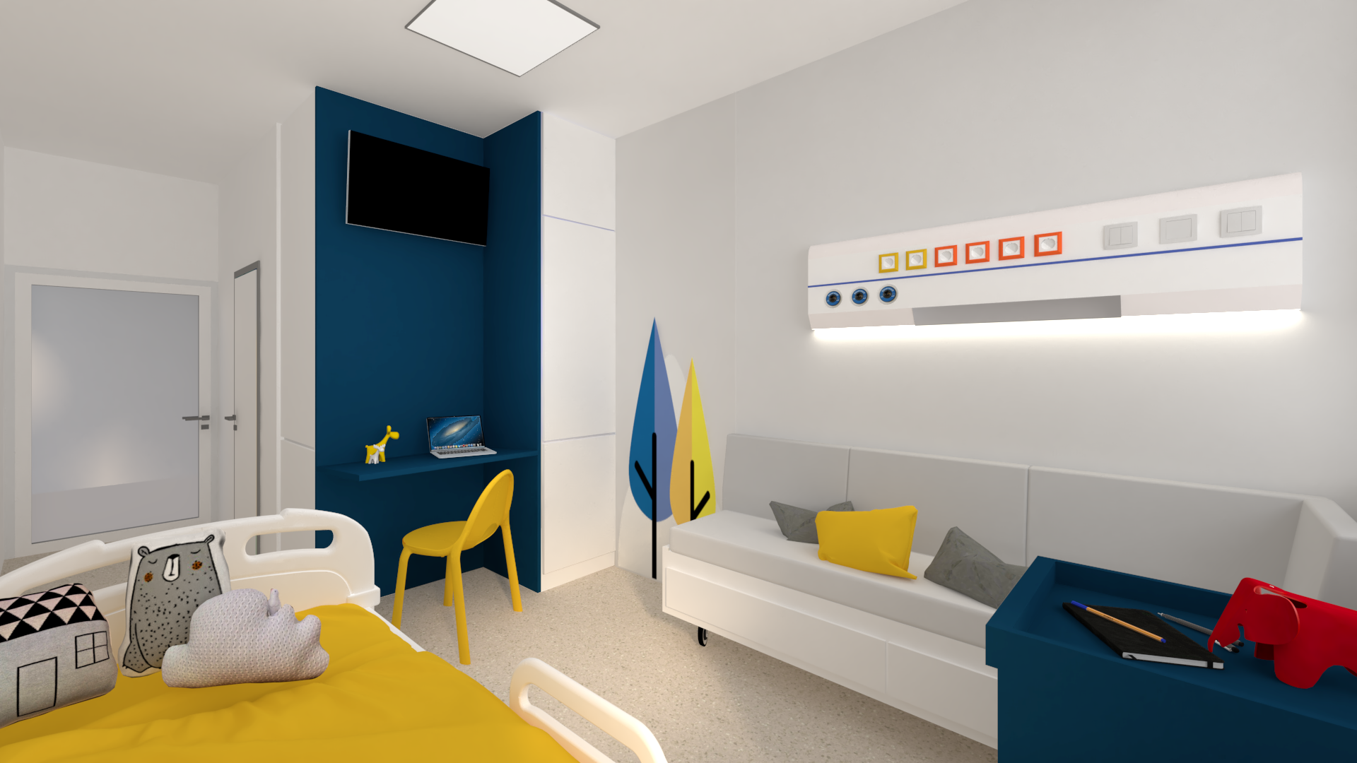 Všetky realizácie sú vykonávané v pôvodných priestoroch oddelenia KPOH (klinika pediatrickej onkológie a hematológie) v Detskej fakultnej nemocnice s poliklinikou v BB, a tak ako všetky oddelenia v tejto nemocnici aj my neustále bojujeme z nedostatkom priestoru. Pri všetkých návrhoch sme teda doslovne museli „čarovať“ veľké veci v malých priestoroch. Napriek tomu sa nám podarilo zrealizovať nové izby pre pacientov, na oddelení vytvoriť herňu, skrášliť chodby....a stále spoločne pracujeme na ďalšom skvalitňovaní priestorov nielen pre pacientov ale aj pre zdravotnícky personál.